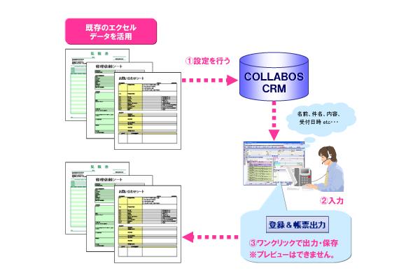今回、提供を開始する新規オプションの「帳票機能」は、Microsoft(R) Excelデータをフォーマットとして設定し、『COLLABOS CRM』に入力・蓄積されたデータを帳票としてMicrosoft(R) Excel形式で作成・エクスポートできる機能です。