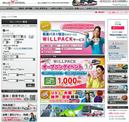 全国へ高速ツアーバスを運行するWILLER TRAVEL株式会社(代表取締役:村瀬茂高 以下ウィラー・トラベル)は平成21年6月17日から、弊社サイト(http://travel.willer.co.jp)にダイナミックパッケージ(以下DP)予約システムを開設し、バスと宿泊施設のセット商品「WiLLPACK」(http://travel.willer.co.jp/bus/pc/3/hotel/top/)の販売を開始いたします。
