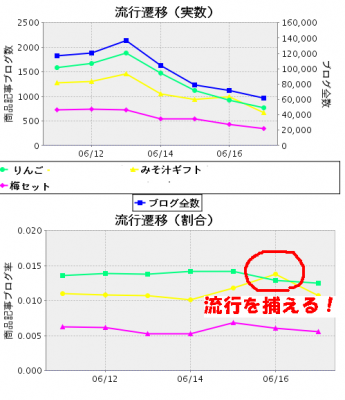 収集したブログの中での商品(商品タイトルキーワード)の流行を記録。