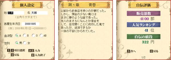 名前や生年月日、自己評価、友人や好みのタイプなどを入力するだけで自伝が出来る『おまかせモード』を搭載。