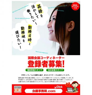 国際会議や学術会議、講演会、セミナー、などの準備をサポートするスタッフを募集しています。世界トップレベルの国際会議はあなたのサポートを必要としています。