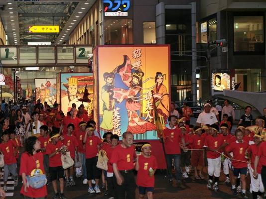 同時に、同じく先生の代表作「横山光輝・三国志」の登場武将によるバナー演出や、巨大とうろうを牽いて子供たちが街中をパレードする「三国志祭」等のイベント開催による街のにぎわい作りに取り組んできました。