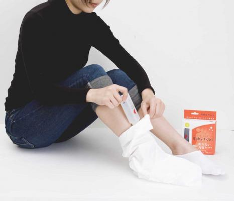 一般的にケミカルピーリングに使用されているフルーツ酸を主成分とした専用のローションに足を2時間浸すだけで、肌の自然なターンオーバーと日常生活で生じる摩擦によって自然に剥がれ落ちてくる、足裏の角質のホームケアキットです。