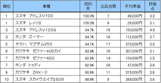 情報流通支援サービスの株式会社オークネット(本社:東京都千代田区/社長:藤崎清孝)は、毎週木曜日開催の二輪中古車TVオークションの成約率上位人気車トップ10をまとめました。