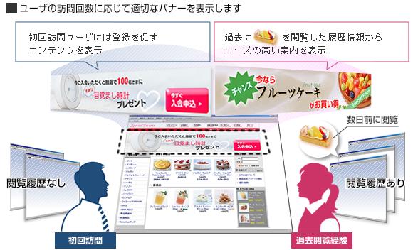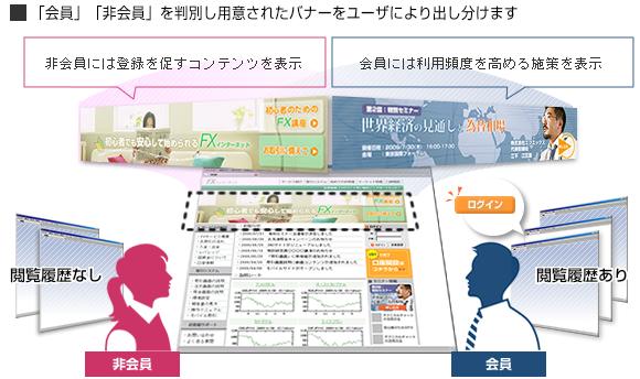 「閲覧履歴機能」は、会員制度を導入しているサイトにおいては「会員」「非会員」判別が可能なため、それぞれのユーザに適切なバナーコンテンツを表示することが可能です。