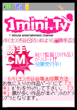 1mini.TV(ワンミニ)とは、1分間で楽しめる携帯動画サイトです( http://1mini.tv ) 。BeeTVなど携帯で動画を提供する有料大型サービスが増えていますが、ワンミニの特徴は動画の無料配信だけでなく、無料で動画CMを作ることです。ショッピングサイトとしての機能も持っているので、視聴者は動画視聴後、すぐに商品を購入することができます。
