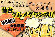 モニター内容: ビールだョ!全員集合~☆「仙台グルメグランプリ」参加店で使える5,000円のお食事券をプレゼントします。当選されたら、グランプリ開催期間中に必ず参加店でお食事をしてください。グループなどでのご利用も可能です。