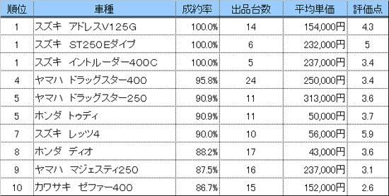 情報流通支援サービスの株式会社オークネット(本社:東京都千代田区/社長:藤崎清孝)は、毎週木曜日開催の二輪中古車TVオークションの成約率上位人気車トップ10をまとめました。