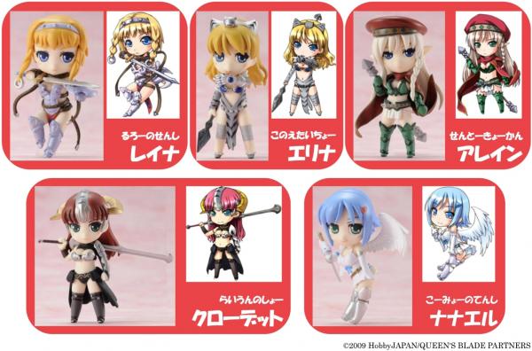 セクシーな美闘士たちの激しいバトルで人気を博したTVアニメ『クイーンズブレイド 流浪の戦士』。その魅力的なキャラクター達が、人気イラストレーターである「おーじ氏」の手によるイラストを元に、可愛いデフォルメフィギュアとして立体化。小さくなっても『クイーンズブレイド』のフィギュアならではの魅力とパーツ構成は健在です。全5種のレギュラーアイテムに加えて、シークレットアイテムが1種用意されており、コレクション性も抜群となっています。