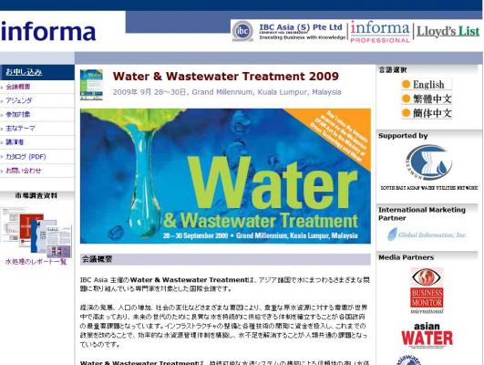 株式会社グローバル インフォメーションでは、皆様の利便性を図る為に、日本語、英語、韓国語、中国語で「Water & Wastewater Treatment 2009」の情報を提供するとともに、会議の参加のお申し込みを承っております。