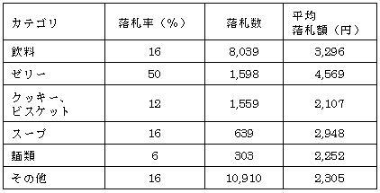 落札数、落札率ともに「飲料」や「ゼリー」と比較して低いことがわかりました。