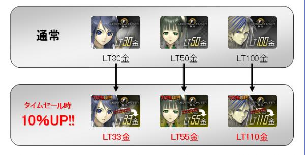タイムセール期間のみ、対象のアイテムチケット(LT30金、50金、100金)が10%増量いたします!