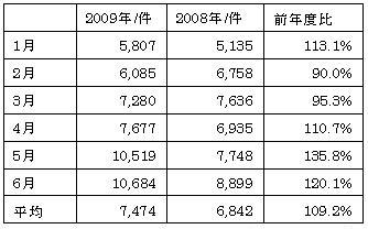 2009の1月は「5,807件」、3月は「7,280件」、6月は「10,684件」の落札数となり、