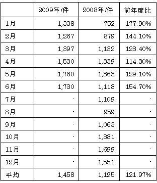 2009の1月は「1,338件」、3月は「1,397件」、6月は「1,730件」の落札数となり、