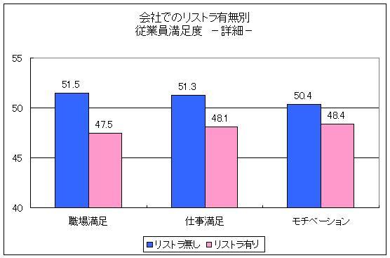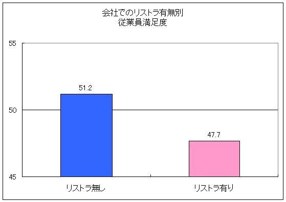 一般的に従業員満足度は職位が高くなるほど高くなる傾向がみられます。弊社の過去の調査結果によると一般社員クラスの平均値と課長クラスの平均値の差異が約3.5ポイントでした。リストラを実施した企業では、課長クラスにおいても、そうでない企業の一般社員クラスの従業員満足度しか有していないことに相当します。