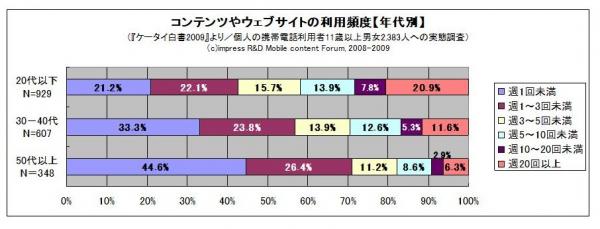個人の携帯電話利用者の実態をまとめた『ケータイ白書2009(インプレスR&D社刊/下図参照)』によると、携帯電話からインターネットにアクセスする方は若い年代ほど利用頻度が高く、20代以下では週5回以上利用するヘビーユーザーの方が約4割を占めています。当サービスにご登録いただいている若手の方々からも、移動中などでも気軽に閲覧できる携帯サイトを求める声が以前より上がっていました。また、昨今の景気悪化により、若いうちからキャリア設計を見直してキャリアアップ転職を考える方々は増えており、今後ますます携帯サイトのニーズは高まっていくと予想されます。
