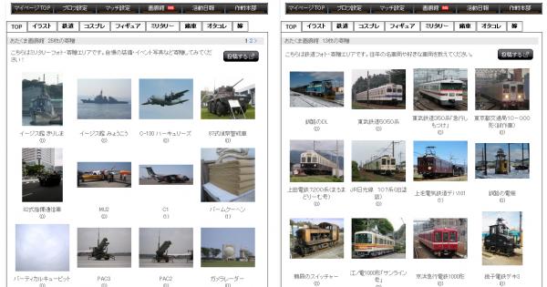 「画廊館」では、ユーザーがこれまでに撮りだめた画像を"イラスト/コスプレ/ミリタリー/鉄道/痛車/オタコレ/俺の嫁"などそれぞれのテーマに別れ投稿することのできる、おたくならではの専用画廊機能となっております。