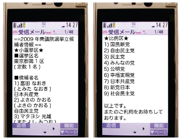 東京都第1区の全候補者名と党派、比例区が携帯メールで送信されます。