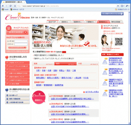 キャリア・プリンセスは7月27日にオープンした医療・介護に特化した求人情報サイトです。現在、約1600件の求人情報が掲載されておりますが、そのうち約1200件が薬剤師の求人となっており、関西地区、中部地区での求人掲載の需要も大きいことから、ほかの職種に先がけて対応いたしました。