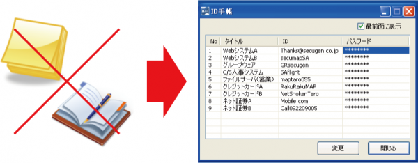 現在お使いのID、パスワードを、全て暗号化されたID手帳で管理できます。ID手帳で管理するID、パスワードの一覧は本人確認後、ファイル出力することもできます。