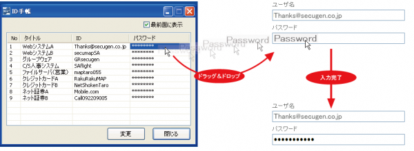 シングルサインオンで対応できないようなシステムへのログインの場合でも、事前に登録したID、パスワードをID手帳からドラッグ&ドロップするだけで入力することもできます。何桁ものIDやパスワードをキーボードから直接打ち込む必要はありません。このような機能をスタンドアロン環境のコンピュータでも導入できるソフトウェアです。