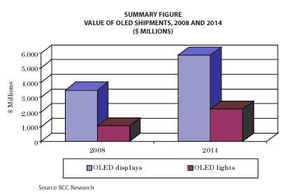 OLED市場では、OLEDディスプレイが優位を占めており、2008年において35億米ドルに到達しましたが、2009年には29億米ドルまで減少するでしょう。しかし、その後5年間の売上はCAGR14.9%で拡大し、2014年にはおよそ59億米ドルに到達すると予測されています。