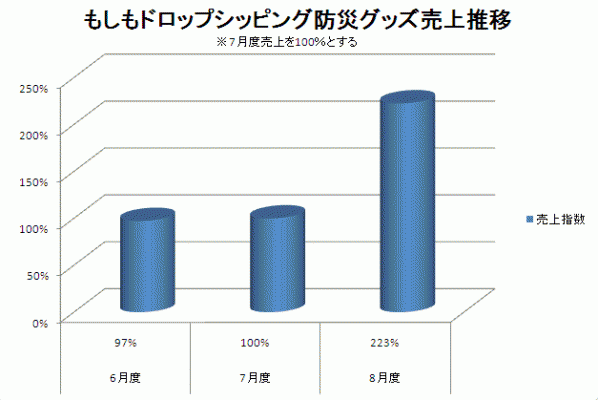 株式会社もしも(東京都渋谷区、代表・実藤裕史)が運営するドロップシッピングサービス「もしもドロップシッピング(www.moshimo.com)」において、2009年8月度の防災グッズ売上が、同7月度と比較して223%に増加いたしました。相次ぐ地震や台風等から防災意識が高まっていると推測されます。