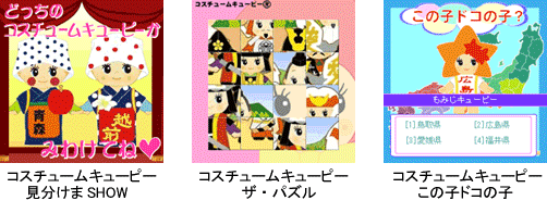 この度、配信開始致しました『コスチュームキューピー この子ドコの子(PART1~6)』『コスチュームキューピー 見分けまSHOW』『コスチュームキューピー ザ・パズル』は、ご当地コスチュームキューピーが登場する、可愛くて誰にでも楽しめるFlash(R)ゲームとなっております。