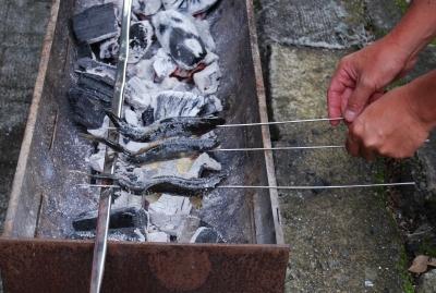 の釣堀に放し、つかみ取り、捌き、串を打ち、炭火で焼き、食す、と