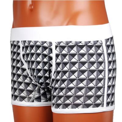 色鮮やかな幾何学模様が特徴のボクサーパンツ。よーく見ると色違いの三角形が4つ合わさって綺麗な四角形を形成しているんですね。4色も集まるとバランスが悪くなりそうなものですが、そこはブラウンバニー。絶妙の配色で幾何学模様を表現しています。小物などで幾何学模様を取り入れている方はたまに拝見しますが、アンダーウェアでは非常に珍しい事です。相当高度なプリント技術がなければここまでの鮮やかさは表現出来なかった事でしょう。アンダーウェアに対するブラウンバニーの誇りとプライドが集結した逸品です。お客様より「すごくカッコイイんだけど選べないんですよー」とのお声を頂きます。アンダーコネクションからのご提案は「感じて下さい。」です。こういったデザインは、パッと見た感じのインスピレーションで選んでいいと思います。例えるならば洋楽のCDをジャケットで選ぶ感じでどうぞ。