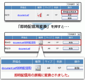 のボタン一つで自動的に即時配信用のTIFF形式に変換が可能です。