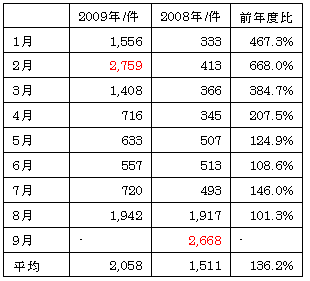 2009年1月「1,556件」、2月「2,756件」と落札数が177%上昇しておりました。