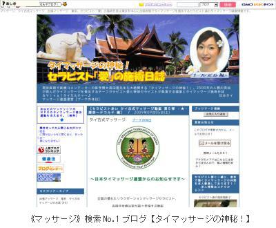 このことによって、日本最大の検索エンジンYahoo Japanによって《マッサージ》界でこのブログ内容がNo.1と認定されたことは、一人でも多くの《マッサージ》検索者が、当店ブログからタイ古式マッサージの有用性を認識され、セラピストあいの【タイマッサージの神秘!】が、タイマッサージ普及に更なる貢献することを念願しております。