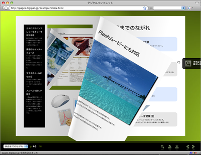 「デジパン」が提供するデジタルカタログは、ドラッグ&ドロップやマウスホイールによるページの移動など、直感的な操作でページの移動が可能であり、それを補う様々なアニメーションにより、あたかも本をめくるような操作性を実現しています。