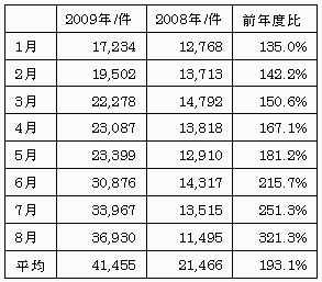 特に、2008年8月と2009年8月を比較すると、前年度比321%の伸びとなっており、