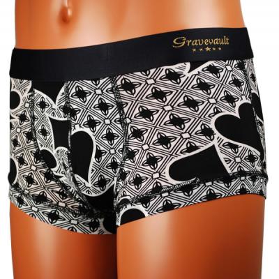 Gravevault/グレイブボールトの提案するトランプ柄のボクサーパンツです。形はグレイブボールトの定番ローライズボクサー。総柄で尚且つトランプをモチーフにしていると派手過ぎるイメージがありますが、3カラー共に大人の男性をイメージしたシックな色合いに仕上げました。これだけ奇抜なデザインを落ち着かせたイメージに仕上げるのはさすがです。女性から男性へプレゼントして間違いのないアンダーウェアだと思います。ストレッチも非常に効いているので、少し小さめをチョイスするのがポイントです。