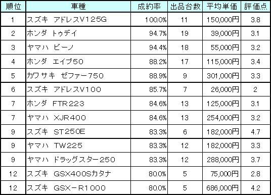 情報流通支援サービスの株式会社オークネット(本社:東京都千代田区/社長:藤崎清孝)は、毎週木曜日開催の二輪中古車TVオークションの成約率上位人気車トップ10をまとめました。