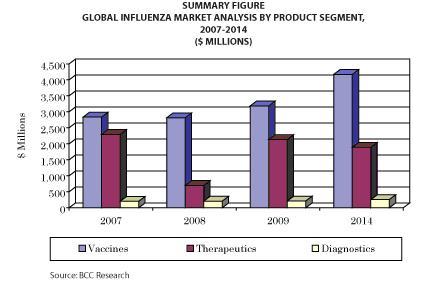 同市場は、ワクチン、治療および診断製品に区分されます。ワクチンのセグメントは、2009年に32億米ドルとなる予測で、このセグメントは今後、CAGR5.6%で拡大し、2014年にはおよそ42億米ドルに到達する見込みです。