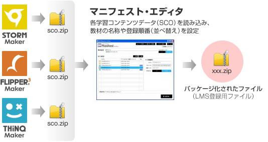 この「マニフェスト・エディタ」は、複数の学習教材コンテンツを任意の順番に並べたコースを構成するためのマニフェスト・ファイルを生成し、さらに各学習教材コンテンツ(SCOと呼ばれる)を読み込んで、一つのZIPファイルにパッケージ化します。