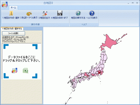 『白地図II』はお持ちのExcelデータを利用して、たった3クリックで色塗り地図を表示できるソフトです。簡単操作で、誰でもすぐに地図を使ったプレゼン資料が完成します。