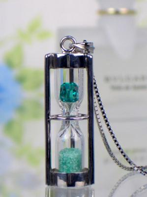 宝石がついた既存のペンダントは貴金属の爪などで宝石を留めていましたが、この砂時計型ペンダントは宝石をガラス管の中に入れることであらゆる角度から宝石の輝き、美しさを楽しんで頂くことが出来る今までになかったペンダントネックレスです。