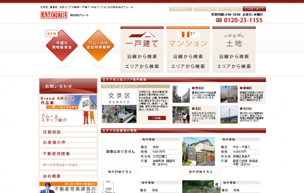 この『株式会社アムール』(http://www.amour-inc.co.jp/)のWEBサイトは、文京区、豊島区、北区エリアの新築一戸建て・中古マンションを中心とした不動産情報サイトとなっております。自社ホームページ構築支援ASP「不動産検索Lab」を利用し、ポータルサイト「いえらぶ」と連動する形で、サイトを構築しております。