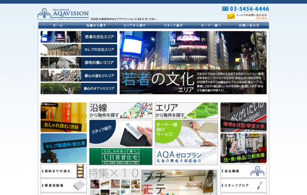 この『株式会社アクアヴィジョン』(http://www.aqavision.com/)のWEBサイトは、渋谷区を中心とした賃貸情報サイトとなっております。自社ホームページ構築支援ASP「不動産検索Lab」を利用し、ポータルサイト「いえらぶ」と連動する形で、サイトを構築しております。