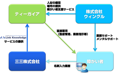 今回の取り組みは、「攻めの障がい者雇用で、名刺を企業の資産に」というコンセプトのもと、企業内に障がい者による営業支援センターを構築する仕組みです。ティーガイアが直接雇用する障がい者社員が、三三の提供する名刺管理ソリューションLink Knowledge(リンクナレッジ)を活用した営業支援業務の一環として、名刺データ入力処理業務を担います。