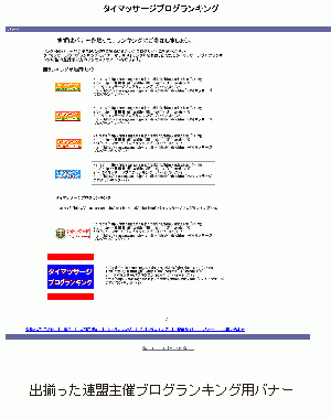 ランキング参加用のバナーは全6種。 サイズが88x31のものが4種。125x41のものが 1種。 130x130のものが 1種。となっております。ランキング参加者はこの中からお好みのバナーを、ご自分のブログに貼り付けて参加し、ブログの読者が、このバナーをクリックするとINポイントが発生し、このINポイントの多いブログほど現在人気のある(多くの読者に読まれている)タイマッサージブログということになります。(ランキングバナーのデザインは添付画像をご参照ください)