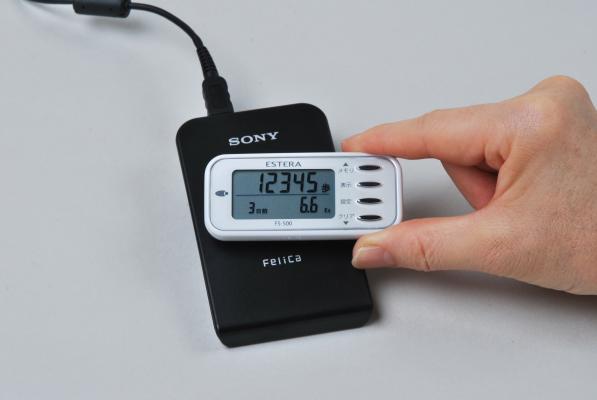 新商品は、業界で初めて ソニー株式会社のFeliCa Plugを内蔵した通信式歩数計です。PCに搭載されたフェリカポートやソニー株式会社のPaSoRi(パソリ)を介し、歩行データを瞬時にPCに送信することができます。