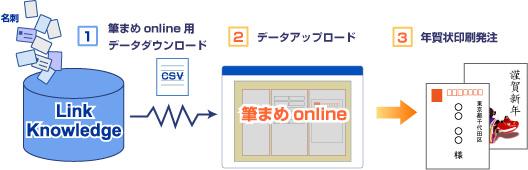 「名刺はきちんと管理しなければと思いながらも、どうも面倒で結局机の引き出しで眠ったまま・・・」という営業マンの声をよく耳にする。リンクナレッジの名刺管理方法は極めてシンプルで、日々交換する名刺を専用スキャナで送信するだけという、たった10秒の作業で名刺情報が即時データ化される。必要な情報はPC・携帯どちらからでも閲覧することが可能になる。しかも実際の名刺画像自体も見ることができるので、PCや携帯電話がまるごと名刺ホルダーになる。そうやって作られた正確なデータを「筆まめonline」にダウンロードすれば、面倒な作業が一切なく、驚くほどカンタンに年賀状の宛名印刷データが完成するというわけだ。