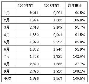 2009年の同市場合計では1月は「2,011件」、5月は「1,979件」、9月は「2,076件」