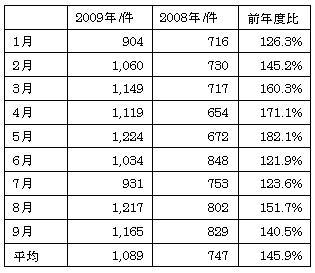 2009年の同市場合計では1月は「904件」、5月は「1,224件」、9月は「1,165件」