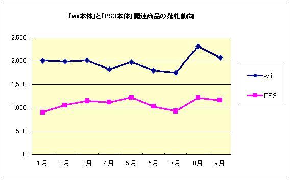調査の結果、「wii本体」関連商品が「PS3本体」関連商品の約2倍の落札数となっているが